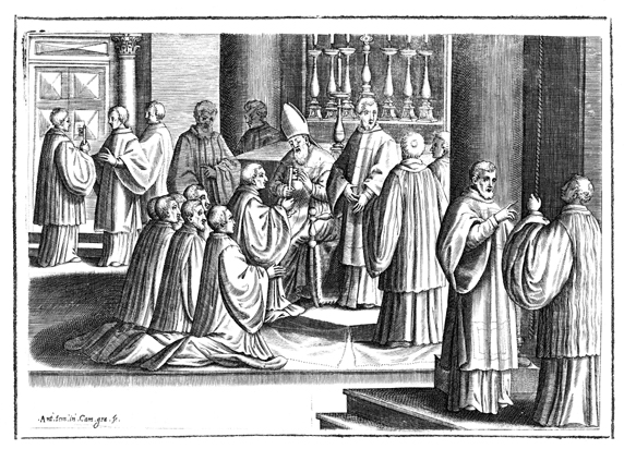 Description: This engraving illustrates ordination to the minor order of porter or doorkeeper, the first of seven ordinations culminating in full priesthood. The bishop gives a large key to the candidate for ordination, who kneels before him.