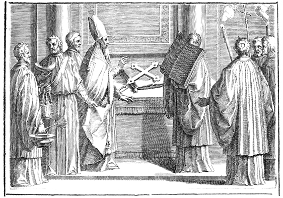 Description: This is the first of two engravings illustrating the blessing of a new cross for a church. The bishop blesses the cross with incense and holy water.