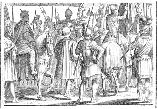 Description: This engraving illustrates a ruler traveling with an army.