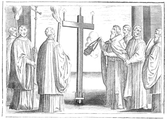 Description: This engraving is the last of six illustrating the blessing of a cemetery. The bishop makes the sign of the cross with the thurible before the center wooden cross.