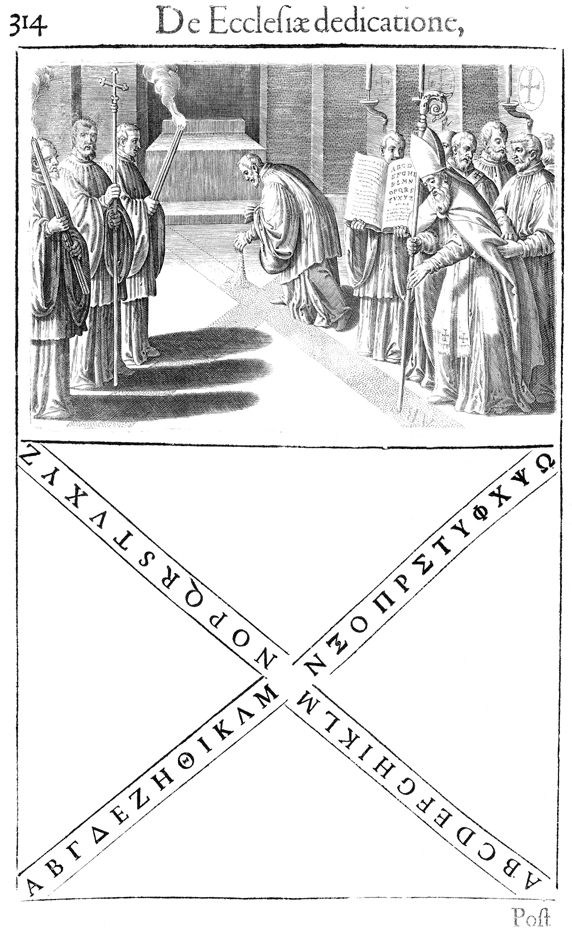 Description: This engraving is the fourth of eighteen illustrating the dedication or consecration of a church. After a priest makes a cross with ashes from the four corners of the church to the center. The bishop then draws with his crozier the Greek alphabet along the arm of the cross beginning at the angle to the left of the entrance to the church. Then he draws the Latin alphabet beginning at the angle to the right of the entrance.