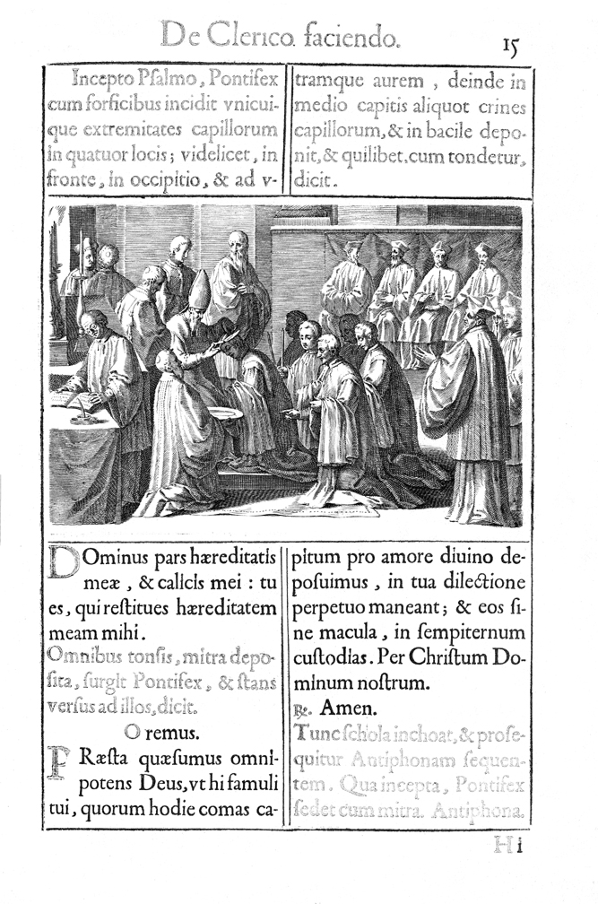 Description: This engraving illustrates one aspect of the sacrament of priestly ordination. The bishop, seated on his throne, is ritually cutting the hair of the man to be ordained, that is, giving him tonsure. He cuts in four places, front, back, over the ears and the crown of the head.