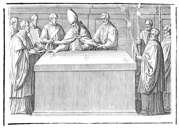 Description: This engraving is the fifth of nine illustrating the consecration of an altar, when this is not part of the ceremony for the dedication of a church. With his right hand, the bishop makes five crosses on the surface of the altar using holy oil, first in the middle and then in the four corners.