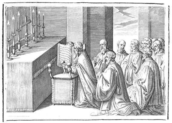 Description: This is the first of two engravings illustrating the blessing of a new cross for a church. The bishop blesses the cross with incense and holy water.