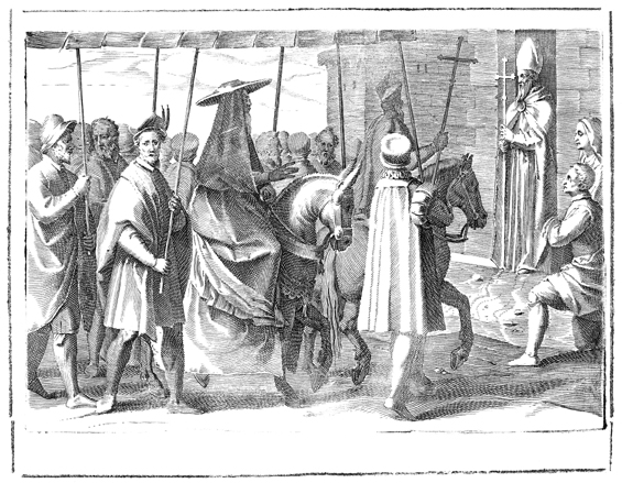 Description: This engraving illustrates the reception of a traveling legate by the bishop of a locality.