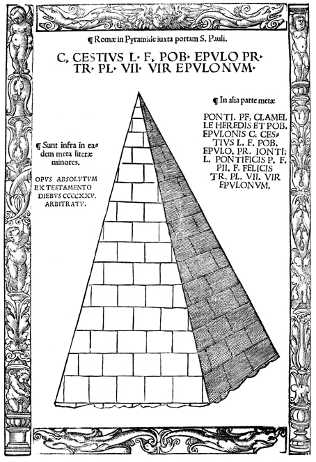 Description: Depiction of a pyramid within an ornamental border of putti, urns, and scrollwork.