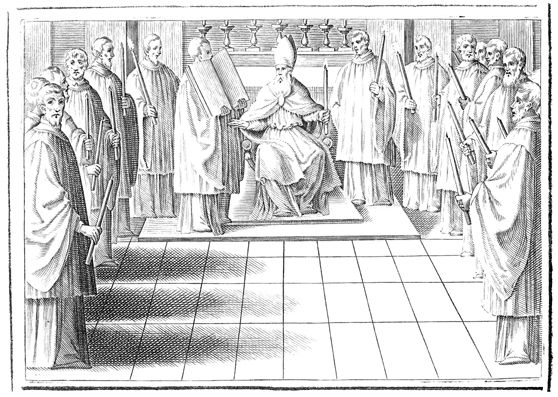 Description: This engraving illustrates the rite of solemn excommunication. The bishop sits surrounded by twelve priests in a public place, each with a lit candle in his hand. The bishop then pronounces the anathema against the one to be excommunicated, after which all strike out their candles against the ground.