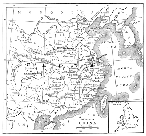 Description: Map of China indicating missions of the Methodist Episcopal Church in China, with an inset showing England and Wales.