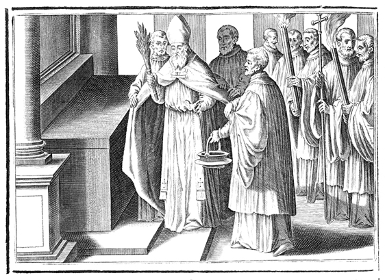 Description: This engraving is the eighth of eighteen illustrating the dedication or consecration of a church. The bishop blesses the new altar by sprinkling it with holy water taken from an aspersorium using a hyssop branch as an aspergillum.