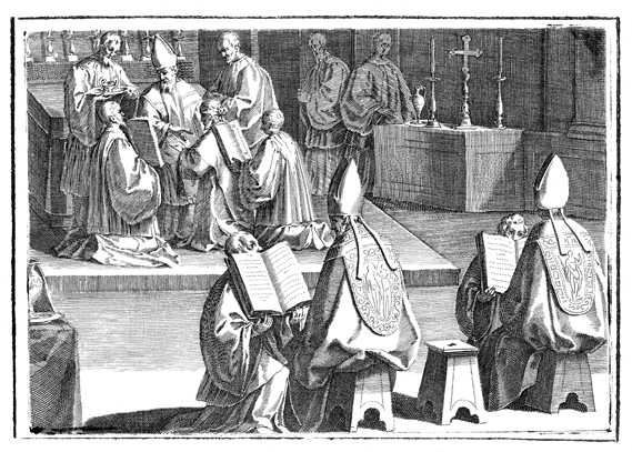Description: This engraving is the sixth in a series of twelve illustrating the consecration of a new bishop. The bishop-elect with the strip of linen (mappula) tied around his head, kneels before the presiding bishop who anoints both his hands with holy oil. Another priest continues to hold the book of the Gospels open against the bishop-elect’s back.