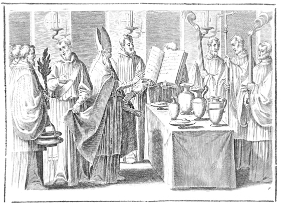 Description: This engraving is the fifth of eighteen illustrating the dedication or consecration of a church. The bishop stands before a table on which stand vessels filled with salt, ashes and water and blesses them.