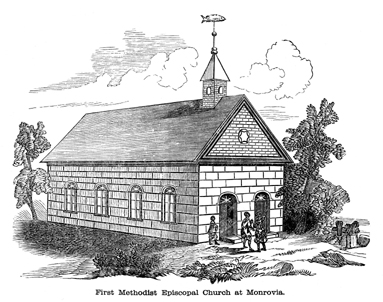 Description: Shows the first Methodist Episcopal Church building in Monrovia, constructed circa 1833 by missionaries of the Methodist Episcopal Church.