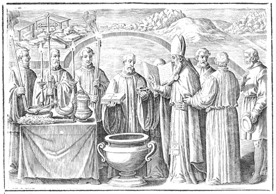 Description: This engraving is the second of five illustrating the blessing and laying the first stone of a new church building. Standing in the place where the church will be built, the bishop blesses salt and water.