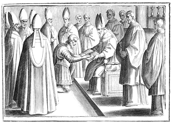 Description: This engraving is the second of ten illustrating the blessing and coronation of a king. The king kneels before the presiding bishop and places his hands on the book of the Gospels that is offered to him by the bishop. All the auxiliary bishops and priests look on.
