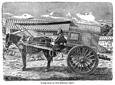 Description: Yung Sun rides in a Chinese cart, also known as a mule litter. Missionaries of the Methodist Episcopal Church sometimes journeyed throughout China in these carts, although the most common means of transportation was on horseback, with a mule cart following, carrying books, bedding, and provisions.