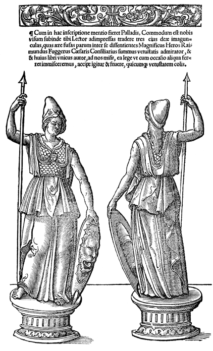 Description: A front and rear depiction of the Roman Goddess Minerva with a spear and shield.