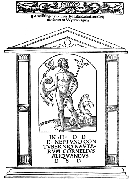 Description: A depiction of the Roman God Neptune within an archway below a scrollwork border.