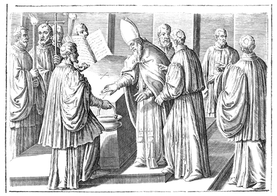 Description: This engraving is the second of four illustrating the consecration of a portable altar (or possibly a side altar). Taking some of the blessed water in his hand, the bishop makes the sign of the cross in the middle of the altar.